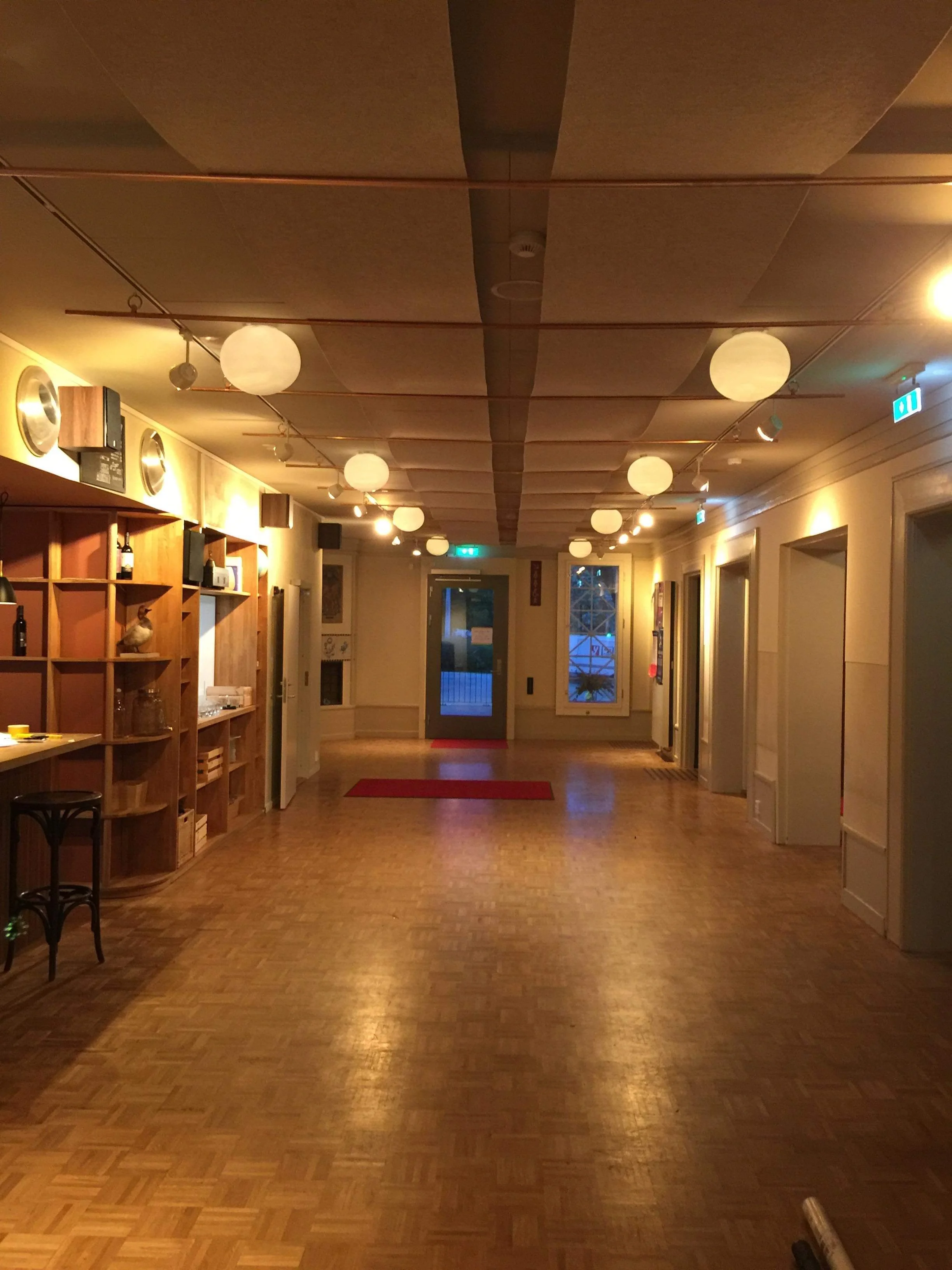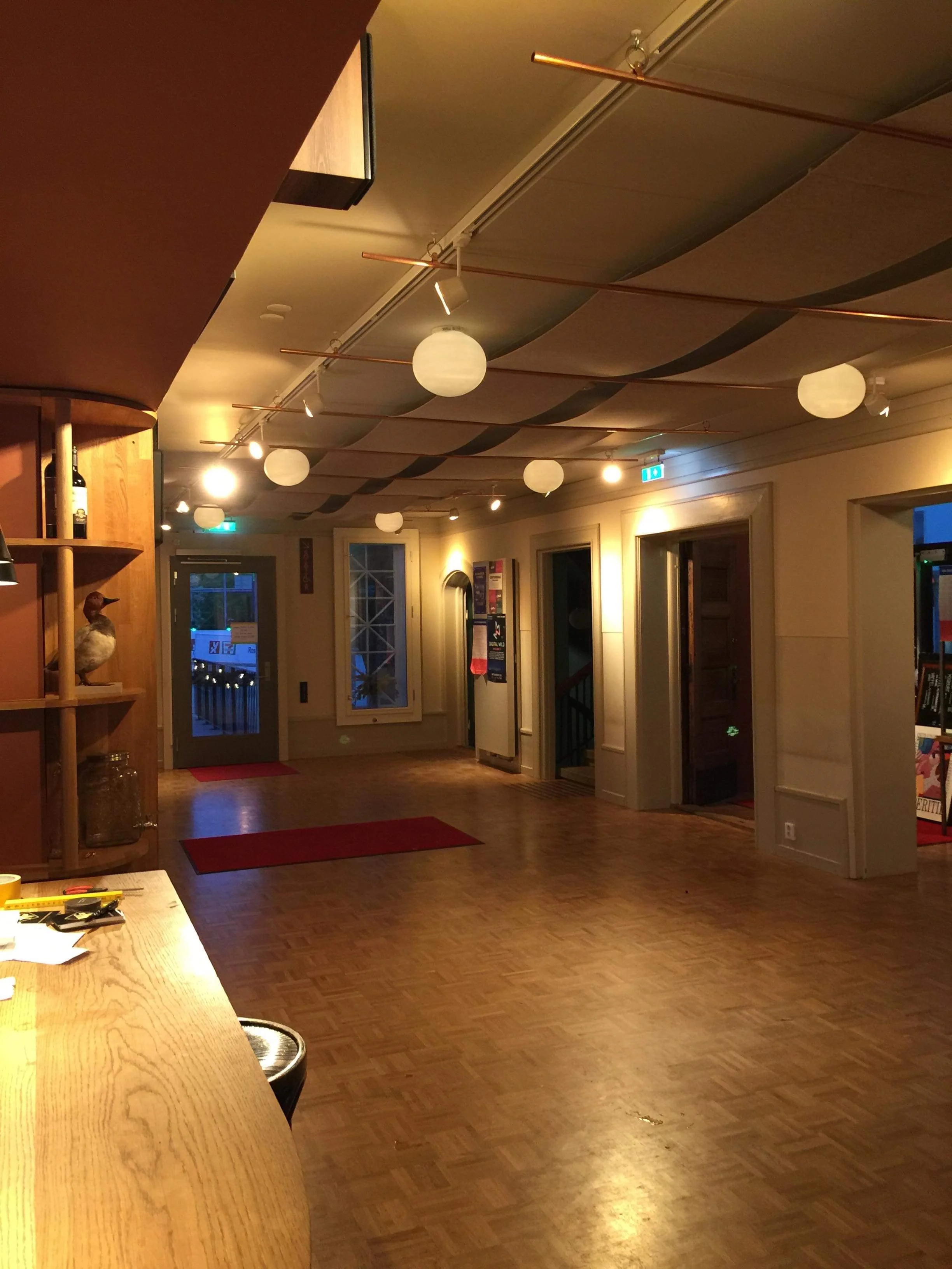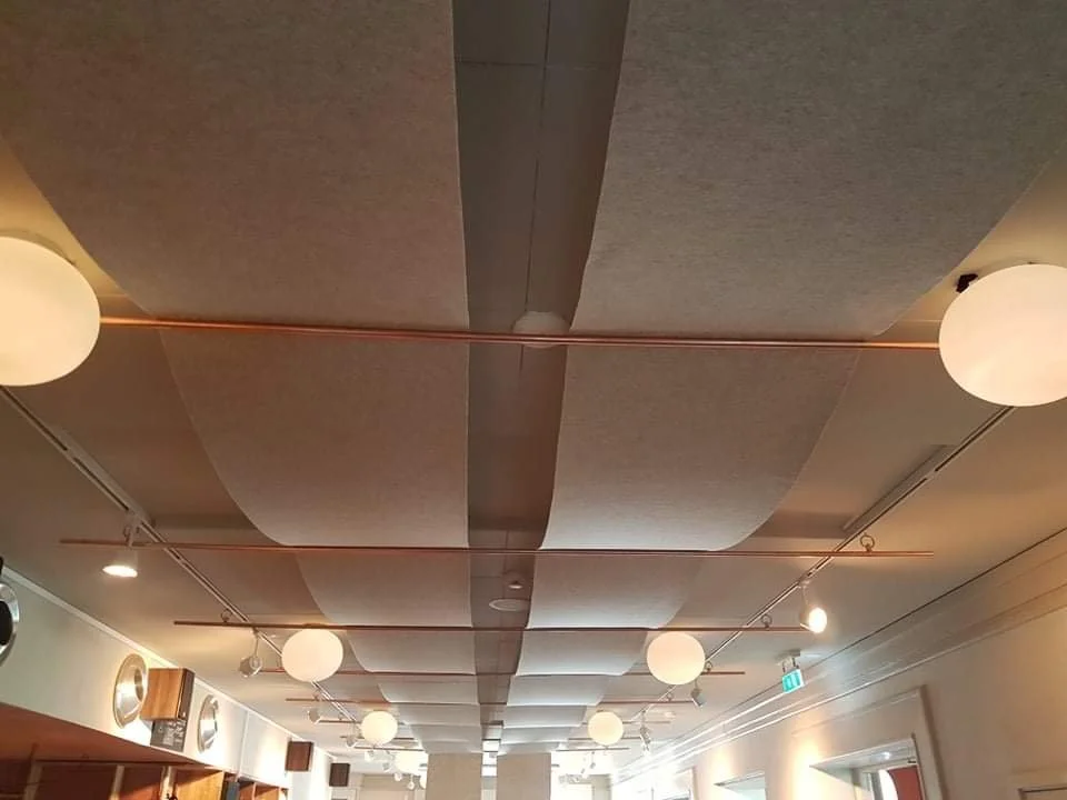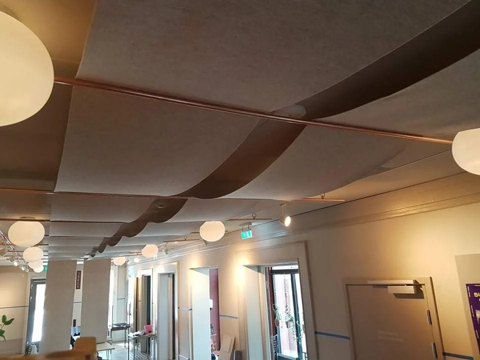 Lyddemping og utsmykning av café for forbedring av lydbilde.Trappehus/oppgang, filt tapetsering av vegger på café samt kunstinstallasjon i tak/himling. Ble kontaktet ang akustikk problematikk i bygget, dette gjaldt da særlig Cafe Avant Garden. Oppdraget ble delvis sponset og jeg hadde tilgang til håndverkere og fagfolk under prosessen.